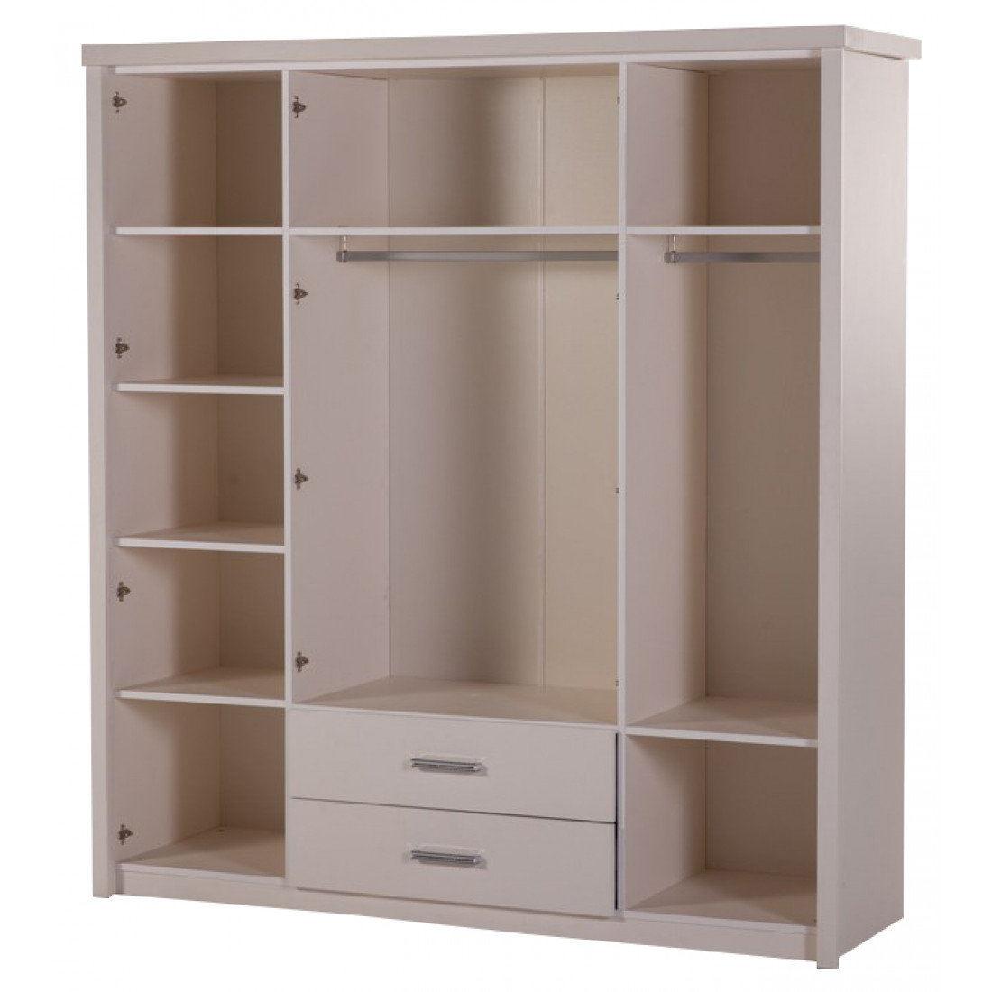 Четырехстворчатый распашной шкаф MIRA-20 (белый) серии Мира для обстановки спальни от Беллона наделен потрясающей вместительностью: в его недрах вы без труда разместите обширный гардероб всей семьи. Рекомендуем купить большой плательный шкаф также для обстановки просторной спальни – стильное оформление и элегантный дизайн создасть ощущение неповторимости и изысканности интерьерного решения всего дома «с порога».