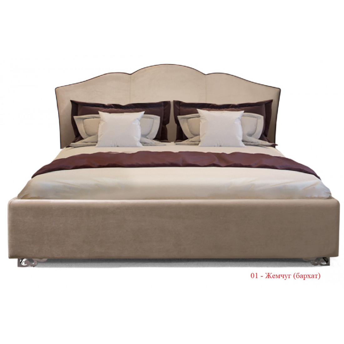 Изголовье на торцах обшито контрастным декоративным кантом. Чехол на царги поставляется уже в готовом, сшитом виде п-образной формы и крепится на липких лентах.Цветочную тему в дизайне кровати отлично поддерживают металлические ножки с растительным орнаментом.