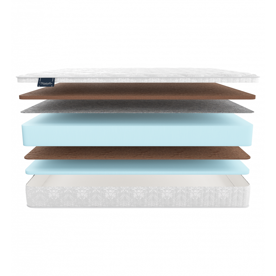 Жесткость первой стороны достигается благодаря комбинации 3 см латексированной кокосовой койры и блоку пены natural foam 22-ой плотности (эта плотность характеризуется как наиболее универсальная и эластичная). Она задает особую ортопедическую прочность и упругость данной стороны матраса. Прослойка из 100% натурального термофиксированного фетра гарантирует надёжность и продлевает «жизнь» любого матраса. Средняя жесткость второй стороны достигается благодаря сочетанию пены natural foam (аналога натурального латекса) и 1 см латексированной кокосовой койры.