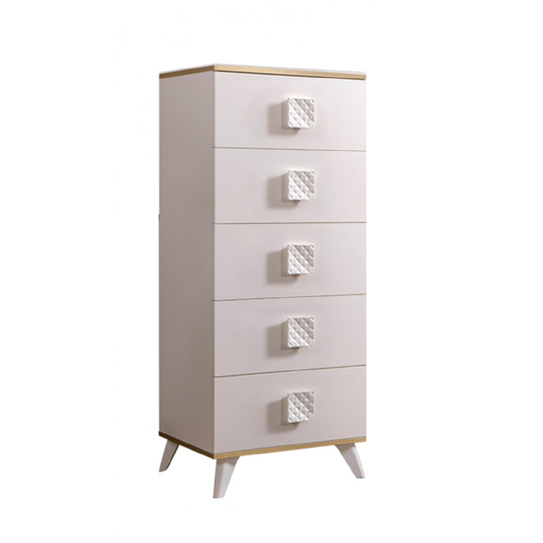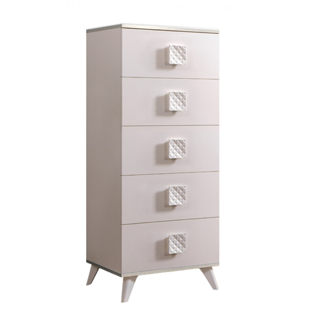 Хорошим технологическим решением стали ножки в тумбочках и комодах спального гарнитура «Diora». Они расположены немного под наклоном к центральной части корпуса, что позволяет добиться хорошей устойчивости в тоже время с точки зрения дизайна это решение не стандартно, так как визуально нарушает гармонию горизонтальных и вертикальных линий, соответственно привлекает к себе больше внимания.