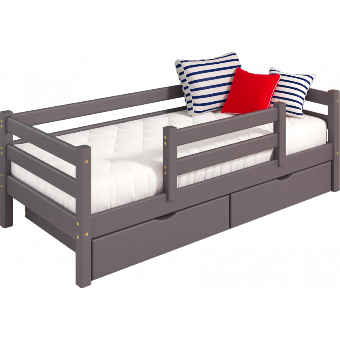 Кровать выполнена из массива дерева, может комплектоваться выкатными ящиками и аксессуарами из текстиля. Отделка выполнена эмалью AqaLAC с добавления красителя цвета "Лаванда".