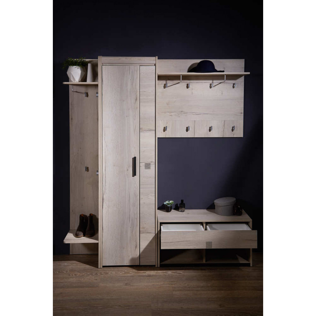 Прихожая «Мале» - обладательница лаконичного и свежего дизайна. Особое внимание привлекают тактильные ощущения от прикосновения к мебели. Декор и структуры, схожие с натуральным деревом по рисунку и шероховатости, придают глубину и естественность. Широкий спектр модулей позволит эргономично использовать Ваше пространство.