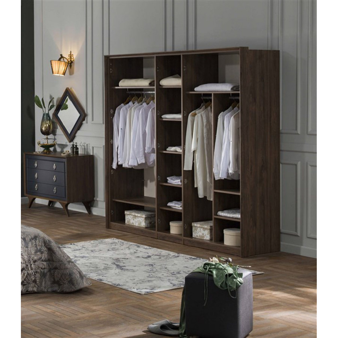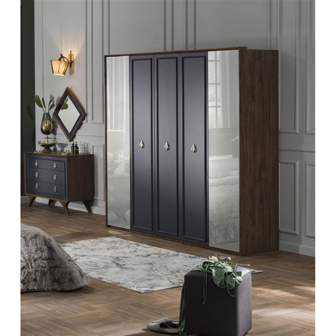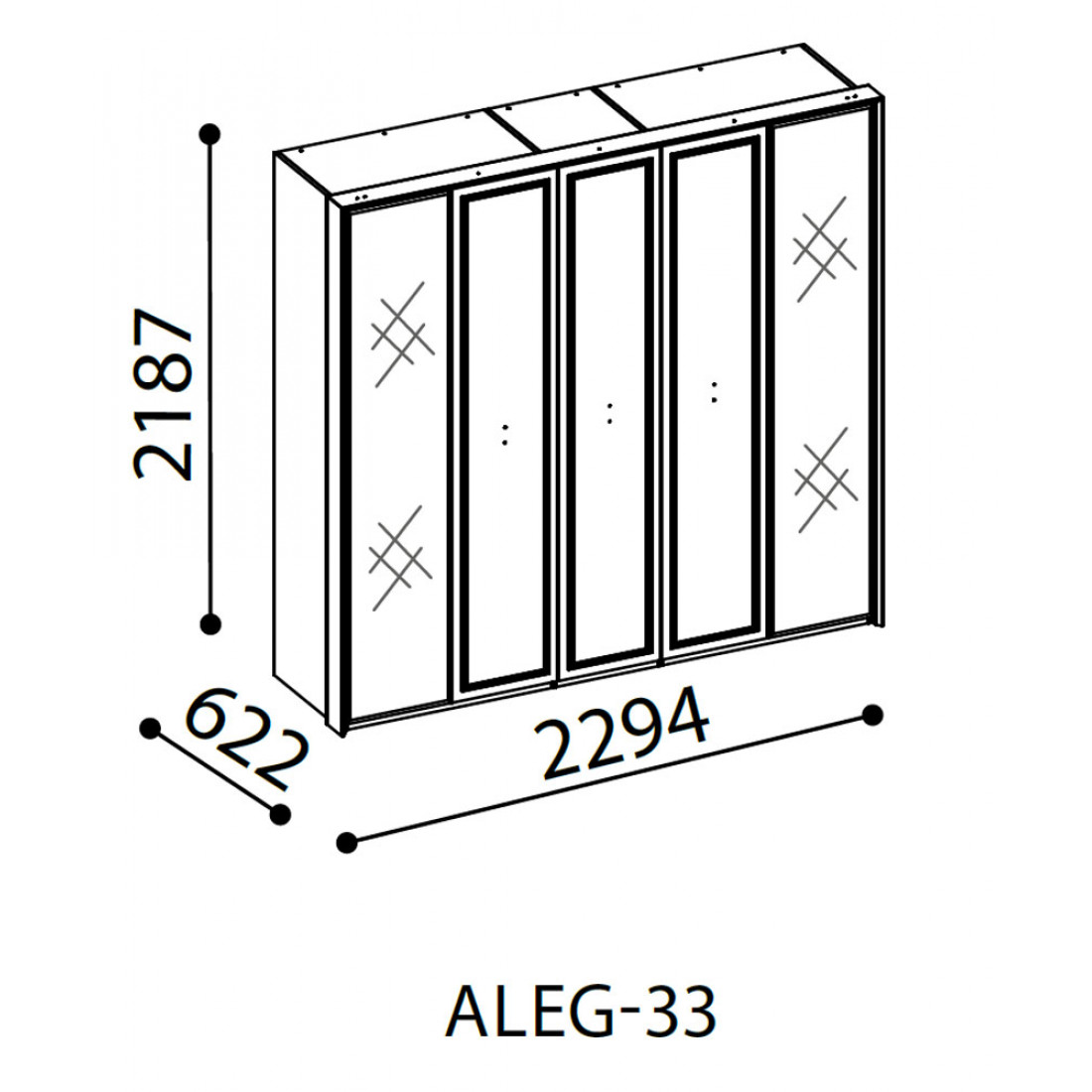 Пятистворчатый распашной шкаф для одежды и белья с зеркалом в спальню ALEG-33 серии Алегро от Беллона – потрясающе великолепное и выгодное предложение для просторных спален и гардеробных от известного турецкого производителя. Больше нет нужды выстраивать линейные композиции и переживать, насколько гармонично, целостно и эффектно они будут смотреться в интерьере – роскошное дизайнерское решение уже готово. Купить шестидверный гардероб гораздо дешевле, чем «набирать» его из отдельных модулей предложенной коллекции.
