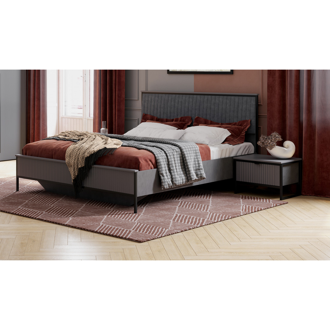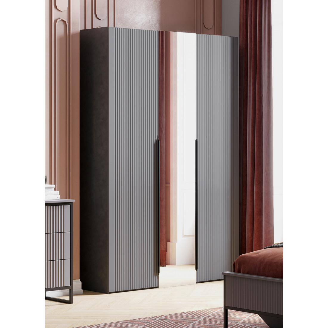Коллекцию модульной спальни "Нора" отличает современный оригинальный стиль. Декоративная продольная фрезеровка на МДФ фасадах цвета "Графит" и опоры на металлокаркасе цвета "Черная эмаль" соответствуют модным тенденциям этого года в ведущих зарубежных коллекциях. Дизайн коллекции гармонирует со стилем минимализм и лофт.