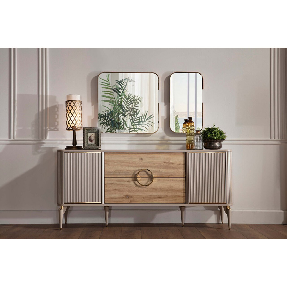 Тумба Санвито SANV-10 от турецкого производителя Bellona станет украшением Вашей гостиной, столовой, залы как в квартире. так и загородном доме. Достаточно длинная (185см),неглубокая (48см), но вместительная, она может использоваться как прилавок, буфет, комод. Тумба Sanvito имеет два глубоких ящика, а также внутренний потайной ящичек для столовых приборов или разных мелочей. Округлые, плавные формы тумбы прекрасно сочетаются с оригинальными ножками. Вертикальные линии фасадов кремового цвета в обрамлении золотистой каймы дополняют древесную фактуру центральных ящиков. Круглая золотистая ручка ящиков подчеркивает оригинальность дизайна.