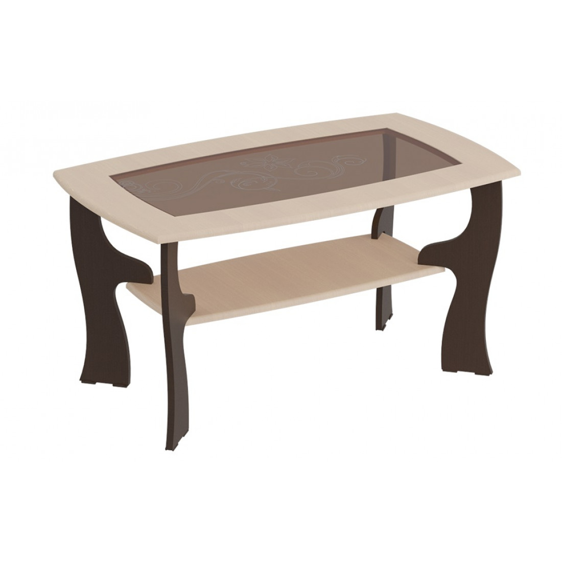 Широкий прямоугольный журнальный столик в гостиную от фабрики МебельГрад со стеклянной столешницей подойдет для оформления современного или классического интерьера. Стекло столешницы тонированное, декорировано пескоструйным рисунком. Стол выполнен в цвете Венге Мали и Дуб Сонома.